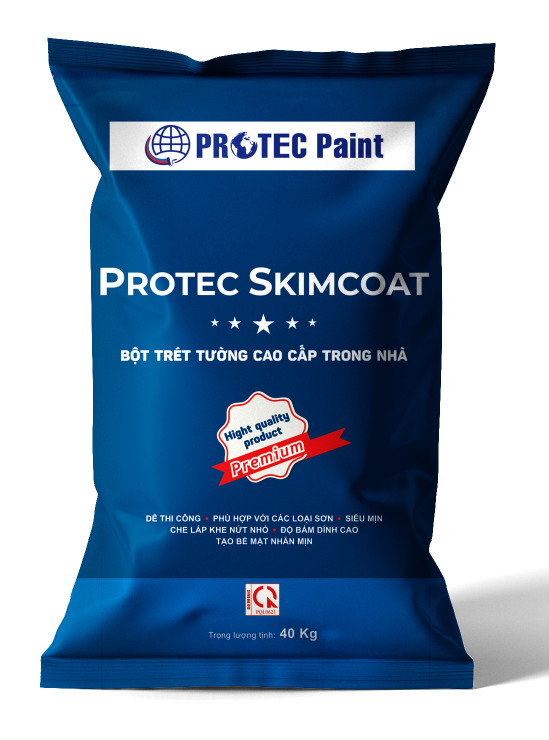 PROTEC SKIMCOAT là loại bột trét tường chất lượng cao, giúp làm phẳng bề mặt tường trong nhà, giảm kiềm hóa của bề mặt tường. Cho bề mặt sơn mịn, đẹp và dễ thi công. Bên cạnh đó, sử dụng bột trét còn làm tăng độ phủ của sơn tốt hơn khi không dùng bột trét.